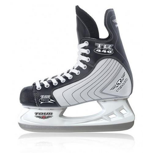 For the latest and greatest in hockey equipment, Tour is high quality with high performance. Tour's TR440 Ice Hockey Skates are top-of-the-line recreational skates from the Carbon Steel Blades up to the Synthetic Upper. Equipped with an incredible support system and built for comfort, the TR440's have a Reinforced Ankle Support and comfortable Cushion Foam Lining and Foam Footbed. The Lace Up design offers easy entry and exit and a nice, tight fit so you can keep focused when you're moving the puck. Lined with polyester and a leather upper you'll have a strong exterior. Hit the pond when it freezes over and work your skills when you sport the Tour TR440 Ice Hockey Skates. Features: Shoe Lining Material: Polyester, Shoe Upper Material: Leather. Liner: Cushion Foam, Recommended Use: Recreational, Blade: Carbon Steel, Skill Range: Beginner - Intermediate, Product ID: 216834